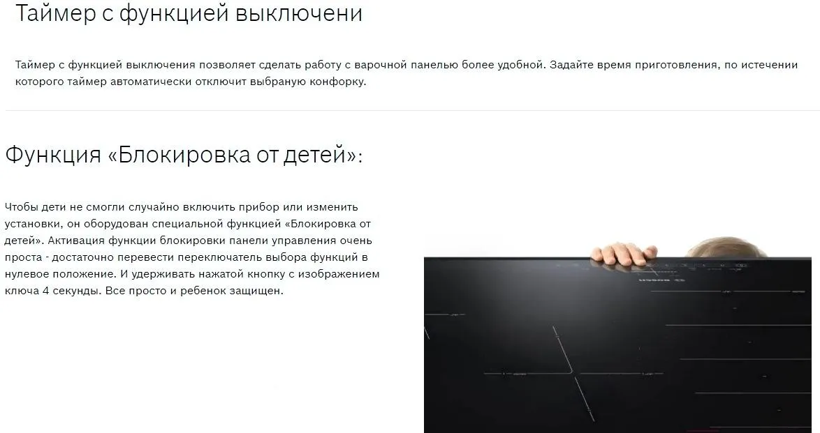 Таймер с возможностью выключения сделает работу с панелью еще удобнее. Достаточно задать время приготовления, по истечении которого отключится нужна конфорка.