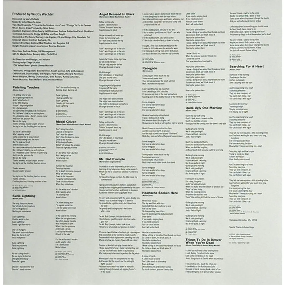 Finishing Touches, Suzie Lightning, Model Citizen, Angel Dressed in Black, Mr. Bad Example, Renegade, Heartache Spoken Here, Quite Ugly One Morning, Things to Do in Denver When You’re Dead