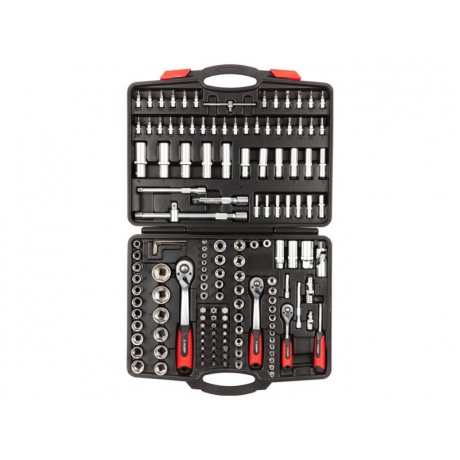Свечные FLANK с резиновой вставкой 1/2 2 шт. — 16, 21 мм. Головка торцовая свечная 3/8 FLANK с резиновой вставкой — 18 мм. Головки торцовые 1/2 E-TORX 2 шт. — Е20, Е24. Головки торцовые 3/8 E-TORX 6 шт. — Е10, Е11, Е12, Е14, Е16, Е18. Головки торцовые 1/4 E-TORX 5 шт. — Е4, Е5, Е6, Е7, Е8. Трещотка с быстрым сбросом 72 зубца 3 шт. — 1/2, 3/8, 1/4 — 72 зубца. Удлинители 1/2 2 шт. — 125, 250 мм. Удлинитель 3/8 1 шт. — 150 мм. Удлинители 1/4 2 шт. — 50, 100 мм. Шарнир карданный 3 шт. — 1/2, 3/8, 1/4. Адаптер трехпозиционный — 3/8M x 1/2F. Вороток-отвертка 1/4 — 150 мм. Т-образный вороток 1/4 — 115 мм. Адаптер для бит 2 шт. — 1/2F x 5/16M, 3/8F x 5/16M. Биты — 5/16 х 30 мм 24 шт. TORX — T40, T45, T50, T55, T60, T70. TORX HOLE — TH40, TH50, TH55, TH60, TH70. PHILIPS 2 шт. — PH3, PH4. POZIDRIVE — PZ3, PZ4. SLOT — SL8, SL10, SL12. HEX — H7, H8, H10, H12, H14. Биты-головки — 1/4 х 35 мм 30 шт. TORX — T8, T9, T10, T15, T20, T25, T27, T30. TORX HOLE TH8, TH9, TH10, TH15, TH20, TH25, TH27, TH30. HEX — H3, H4, H5, H6. SLOT SL4, SL5.5, SL6.5, SL7. PHILIPS — PH0, PH1, PH2. POZIDRIVE — PZ0, PZ1, PZ2. Ключи имбусовые 7 шт. — 1.27, 1.5, 2, 2.5, 3, 4, 5 мм.