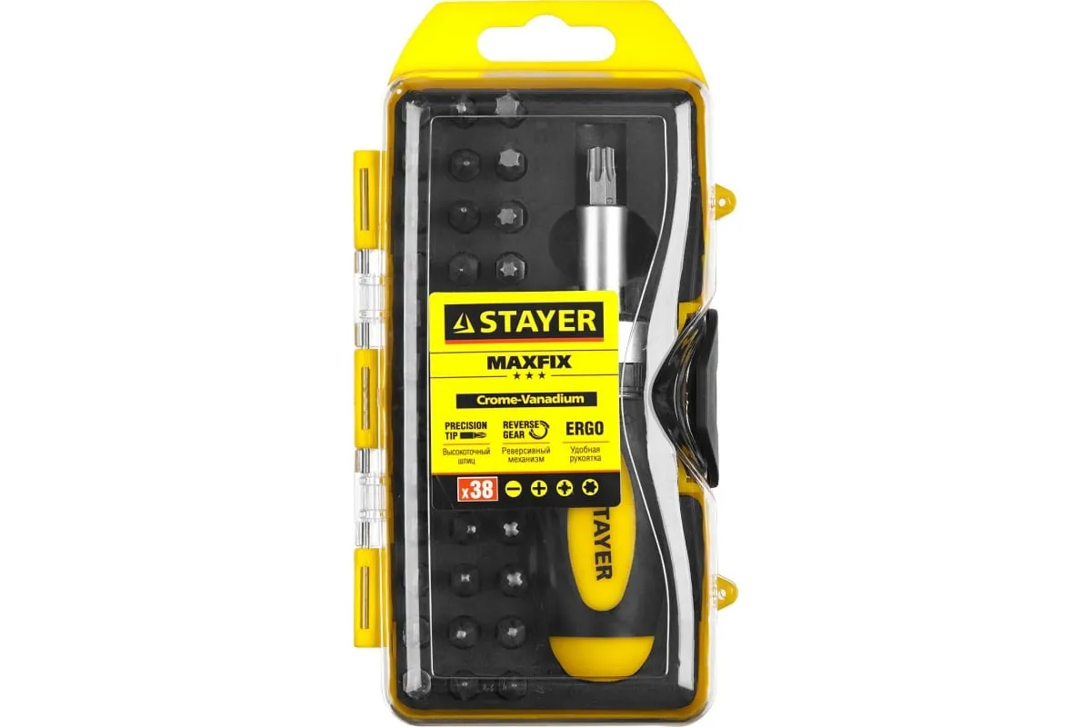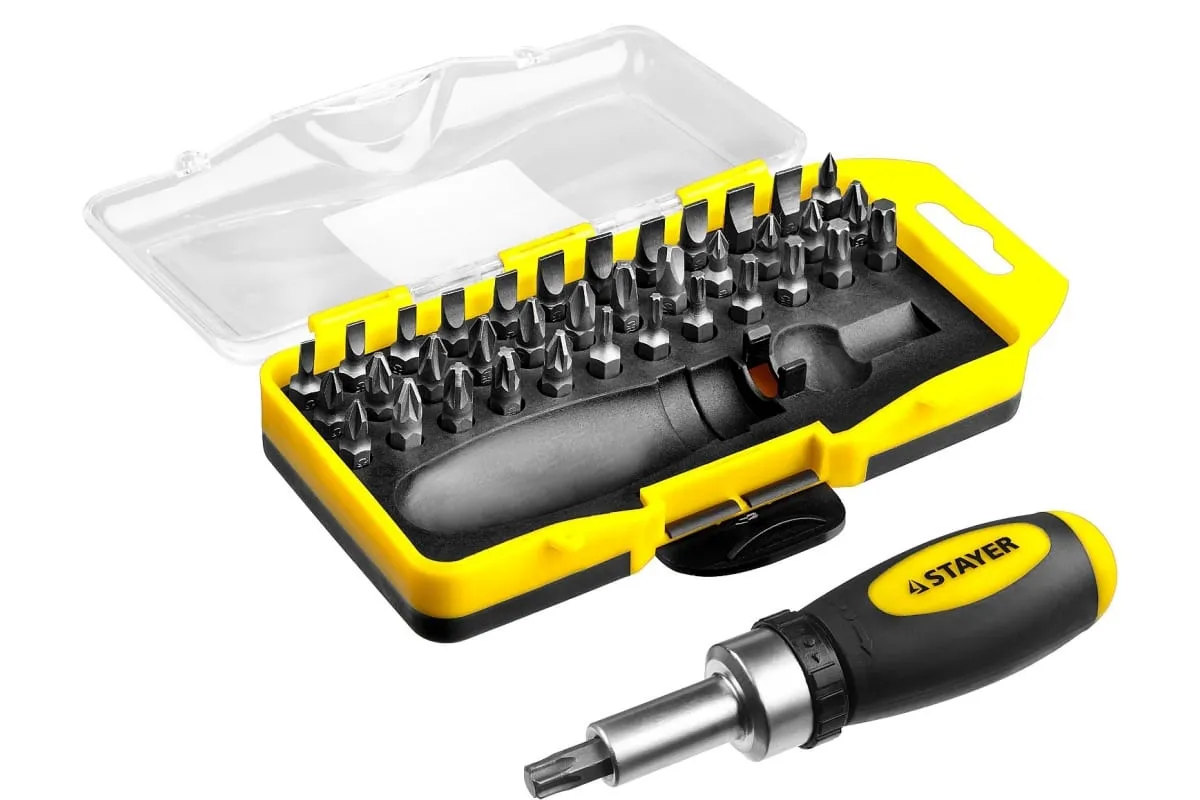 Реверсивная отвертка в наборе с битами STAYER 2557-H38, Cr-V сталь, 38 предметов 2557-H38 поставляется в пластиковом кейсе