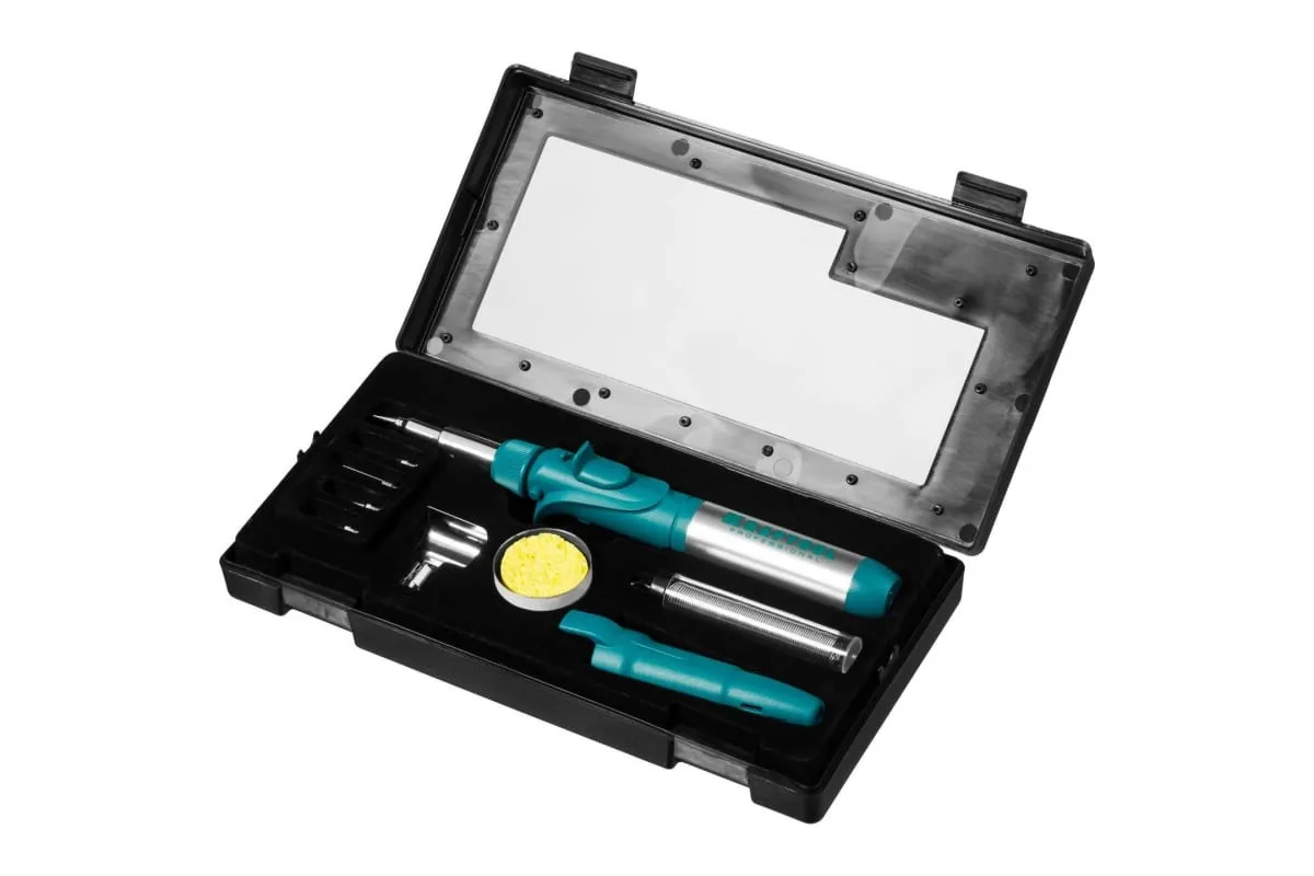кейс, горелка, насадки - 7 шт., защитный колпачек, припой, губка для чистки жал