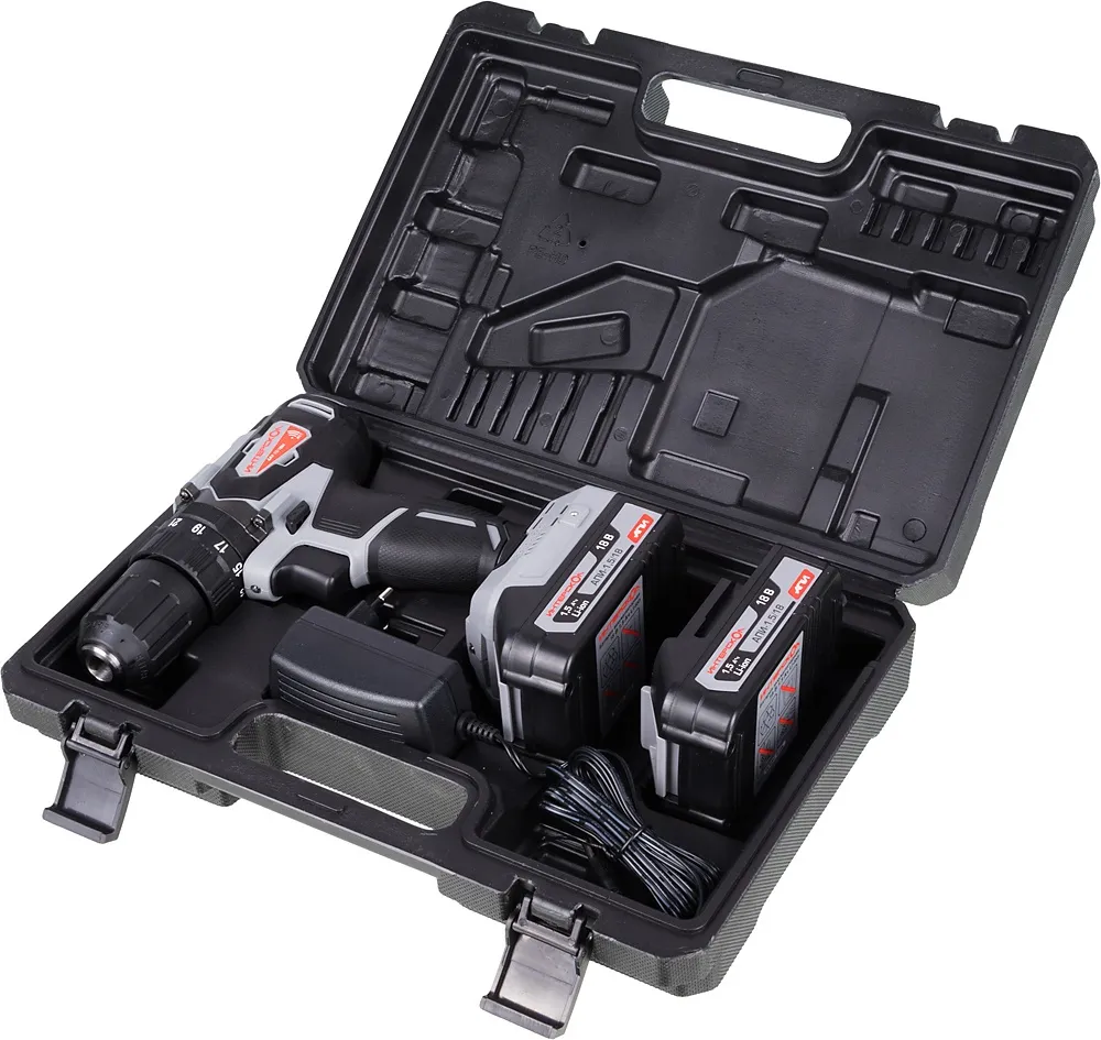 дрель-шуруповерт, аккумулятор 2 шт., документация, зарядное устройство, кейс