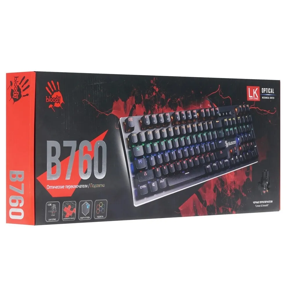 Оптомеханическая клавиатура A4Tech Bloody B760 Neon имеет полноразмерную островную конструкцию. Модель состоит из 104 клавиш типа LK Light Strike с многоцветной неоновой подсветкой. Последнюю можно включать и выключать, а также регулировать ее яркость произвольно. Клавиатура с покрытием из алюминия и защитой от попадания влаги отличается повышенной прочностью, поэтому ей не страшны самые экспрессивные игровые сеты. Ресурс кнопок рассчитан на 100 млн нажатий, что тоже положительно сказывается на сроке службы модели. Проводное подключение клавиатуры A4Tech Bloody B760 Neon к компьютеру осуществляется за счет кабеля длиной 1.8 м и интерфейса USB. Частота опроса модели составляет 1000 Гц, а для удобства использования она дополнена цифровым блоком. Это делает модель удобно не только в прохождении игр, но и в работе с офисными и графическими программами.