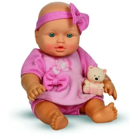 Малышка с мишуткой - милый и обаятельный карапуз. Игры с таким пупсом помогут сформировать у вашего ребёнка чувство ответственности, навыки заботы о младших. Малышку так и хочется взять на ручки и позаботиться о ней.