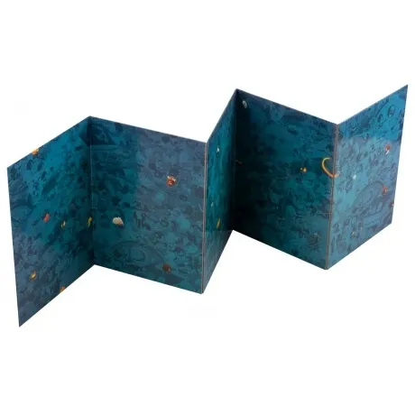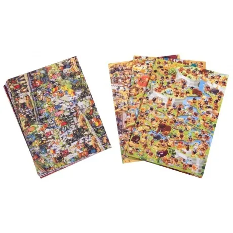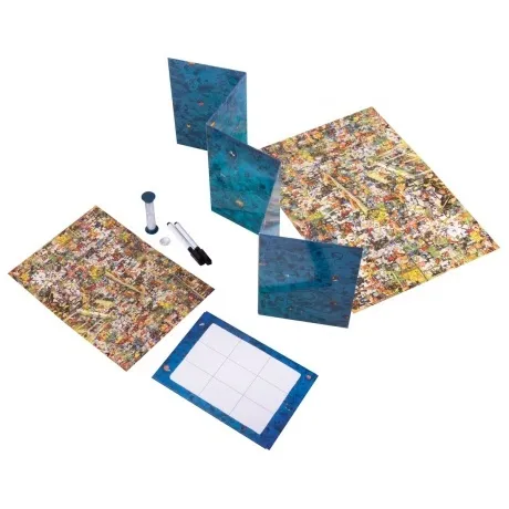 Ширма, 12 двухсторонних листов, представляющих 6 мест преступлений, 3 двухсторонних складываемых листа, представляющих 6 мест преступлений, 4 планшета для рисования, 2 маркера, Прозрачный жетон, Песочные часы