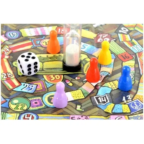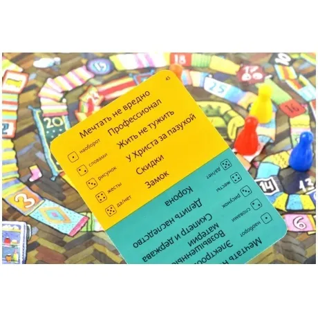игровое поле, фишки 5 шт, карточки 90 шт, песочные часы, пластилин, кубик, правила игры