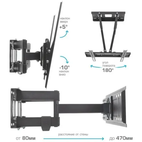 Практичный кронштейн для телевизора Kromax PIXIS-L-2 позволит комфортно разместить технику на стене, что сэкономит свободное рабочее пространство. Минимальное расстояние от стены до телевизора составляет 8 см, а максимальное - 47 см, так что можно подобрать наиболее подходящее. Имеется поддержка креплений VESA распространенных размеров.