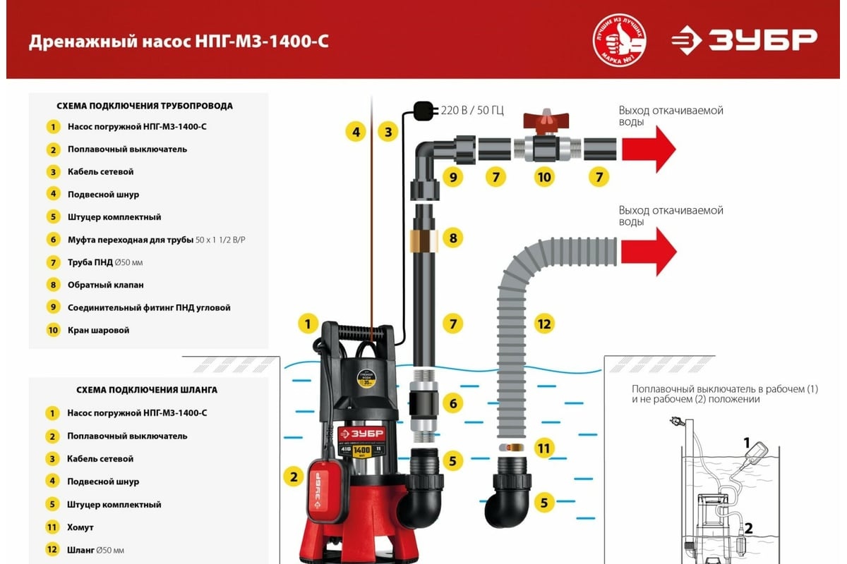 Описание товара Насос погружной дренажный ЗУБР НПГ-М3-1400-С