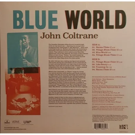 Blue World - никода не издававшийся альбом 1964 года американского джазового саксофониста Джона Колтрейна. Издание также одновременно является саундтреком к французскому фильму Кот в мешке. Релиз представлен на черном виниле. Джон Уильям Колтрейн - американский джазовый саксофонист и композитор. Один из самых влиятельных джазовых музыкантов второй половины XX века, тенор- и сопрано-саксофонист и бэнд-лидер. Наряду с Чарли Паркером, Дюком Эллингтоном, Майлзом Дэвисом, Луи Армстронгом является наиболее значительной фигурой в истории джаза, оказавшей влияние как на современных джазовых музыкантов, так и на школу импровизации в целом. В 1940-е годы оставался относительно неизвестным и играл в различных оркестрах. В 1955 году он присоединяется к коллективу Майлза Дэвиса. Когда Колтрейн решил уйти из квинтета, Дэвис - по условиям контракта с одной из звукозаписывающих компаний - в срочном порядке дописывает с ним в 1956-1957 годах альбомы Relaxin’ (1956), Cookin’ (1957), Steamin’ (1961) и Workin’ (1959). К концу 50-х и к началу 60-х годов Колтрейн создаёт наиболее значимые для наследия джаза альбомы (A Love Supreme, Coltrane Jazz, Giant Steps), являющиеся, по сути, хрестоматией для основ изучения джазовой импровизации. В 1960-е Колтрейн создаёт свой классический квартет, в который вошли пианист Маккой Тайнер, басист Джимми Гэррисон и ударник Элвин Джонс. Квартет Колтрейна считается одной из наиболее значительных групп в истории джаза, а некоторые историки рассматривают его как наиболее влиятельный из всех джазовых ансамблей. В 1962 году Колтрейн делает совместную запись с Дюком Эллингтоном, что свидетельствует о его признании со стороны мэтра. Наряду с этим Колтрейн играл с такими признанными мастерами, как Телониус Монк, Сонни Роллинс, Майлз Дэвис и др.