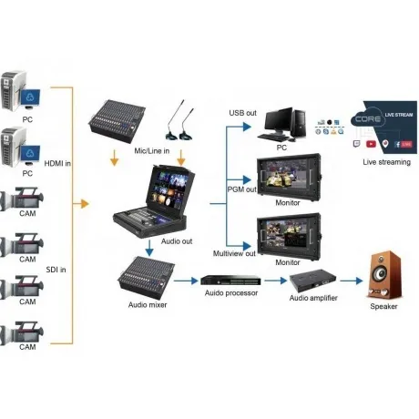 AVMATRIX PVS0613U – это универсальный 6-канальный видеомикшер, который позволяет коммутировать сигналы видеоисточников, микшировать аудиосигналы и использовать различные эффекты переходов при создании видеопрограмм. Формат входного сигнала определяется на входе автоматически, в то время как формат для PGM выхода может быть определен в настройках устройства, для совместимости с большим количеством различного оборудования и более гибкого применения. Устройство также позволяет легко транслировать выступления и презентации через порт USB3.0 компьютера. Видеомикшер оснащен собственным 13.3-дюймовым ЖК-монитором Full HD, что позволяет использовать устройство в самых разных местах для проведения мероприятий, семинаров и т.д.