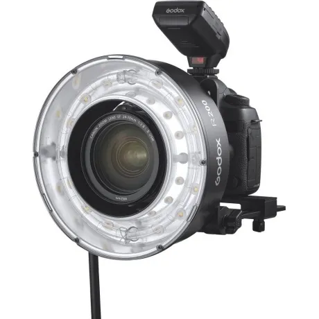 Импульсная головка Godox R200 присоединяется к аккумуляторным вспышкам Godox Witstro AD200Pro и Godox Witstro AD200, чтобы создать практически бестеневое освещение с плавным светотеневым переходом. При этом, Godox R200 помогает передавать все детали, а также создает красивый контур вокруг объекта съемки, что трудно достичь с другими источниками света. Устройство имеет собственную импульсную газоразрядную лампу мощностью до 200 Вт·c и пилотный LED свет 10 Вт (20 светодиодов). Импульсная головка формирует оригинальные блики кольцевой формы на объектах съемки или в глазах модели. Пилотный свет можно использовать не только как моделирующий, но и для устранения эффекта «красных глаз» в портретной съемке. Godox R200 разработана для фотографов, специализирующихся на портретных, бьюти или фэшн съемках, предметных съемках, макросъемках и других. Головка отлично подойдет для случаев, когда нужен компактный кольцевой импульсный источник света в студии или на выезде