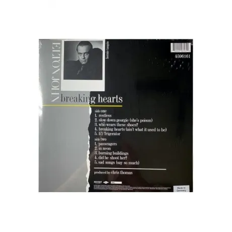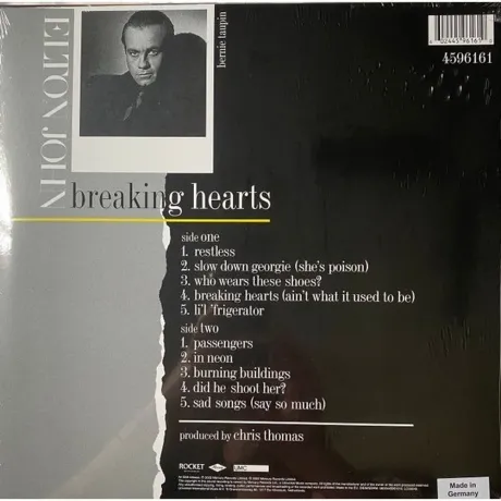 Breaking Hearts - ремастированное переиздание студийного альбома Элтона Джона, первоначально выпущенного в 1984 году. Четыре сингла с этого альбома стали хитами в американском и британском хит-параде: Sad Songs (Say So Much), Who Wears These Shoes, In Neon и Passengers. Релиз представлен на черном 180-граммовом виниле. Сэр Элтон Джон - британский певец, пианист, композитор и радиоведущий. Оказал заметное влияние на развитие популярной музыки. Один из самых коммерчески успешных исполнителей 1970-х годов и один из самых успешных рок-исполнителей Великобритании. За всю свою карьеру он продал в США и Великобритании больше альбомов, чем любой другой британский соло-исполнитель.