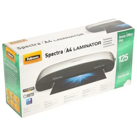 Ламинатор Fellowes Spectra предназначен для работы с документами формата А4. Допускается использование пленок толщиной до 125 мкм. Нагревательная система состоит из 2 валов и обеспечивает высокое качество ламинирования. Время нагрева составляет 4 минуты. Функция Auto Shut off автоматически отключает ламинатор через 30 минут простоя для экономии электроэнергии. Ламинатор без возможности регулировки температуры. В комплекте идет стартовый набор для 10 документов.