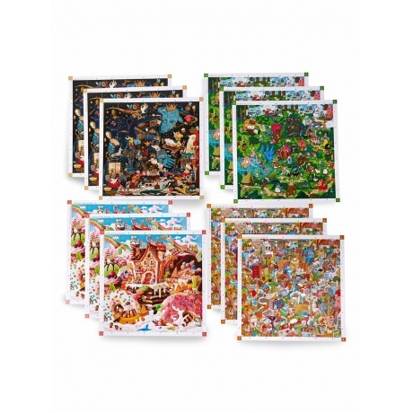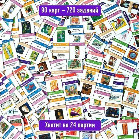 игровые поля - 8 шт. (3 набора), карты - 90 шт. (720 заданий), фишки - 7 шт., пластилин - 1 шт., золотая штука - 1 шт., конверт – беговая дорожка - 1 шт.
