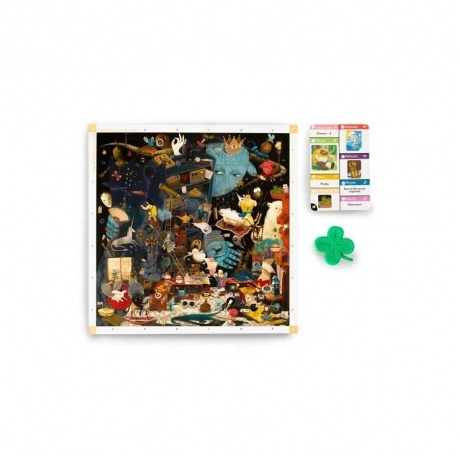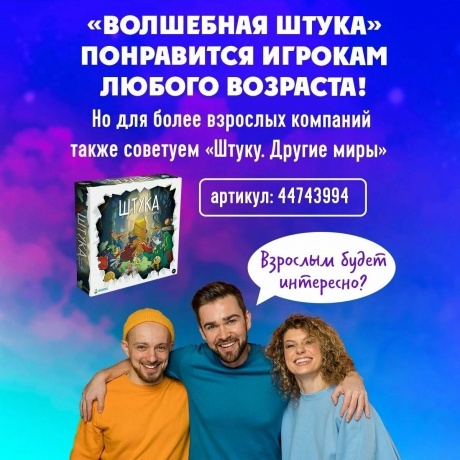 Магическая версия игры «найди и покажи» для всей семьи! «Волшебная штука» – веселая настолка, которая яркими иллюстрациями со множеством фрагментов напоминает виммельбух для малышей. Но это скорее игра в слова вроде Alias и «Активити», только вот ответы нужно искать на полях-картинах. Простые правила не вызовут сложностей даже у тех, кто редко играет в настолки. Один игрок объясняет загаданное на карточке: словами, жестами, рисунками, с помощью пластилина. Другие ищут нужный фрагмент на поле и стараются быстрее всех схватить Золотую Штуку! За правильный ответ фишка идет вперед, за неправильный – назад. Одним словом, такого развлечения у вас наверняка еще не было! Каждое поле – волшебный другой мир, задания максимально разнообразны, «беговая дорожка» выглядит, как ходилка, а яркая коробка украсит любой семейный праздник. Эта настольная игра для детей от авторов «Экивоки» подходит для 3?7 человек. Партии быстрые и никто не успевает заскучать. Классный подарок семье на Новый год, подарок художнику и любимому ребенку. «Волшебная штука» станет отличным дополнением для тех, кому нравится игра крокодил и «Кто я», а также интересные игры для детей и всей семьи типа «скажи иначе».