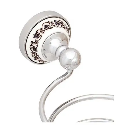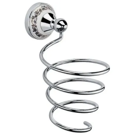 Держатель для фена в ванную комнату. Держатель выполнен в элегантном дизайне, который будет органично смотреться в интерьере ванной в классическом стиле или ретро. Керамический декор настенных креплений белого цвета с черным изящным орнаментальным узором.