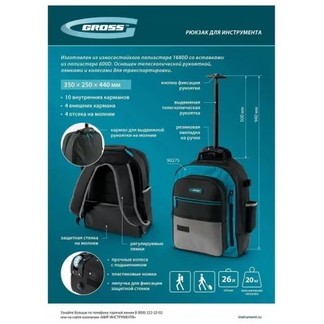 Описание товара Рюкзак для инструмента, 440х350х250мм, выдвижная рукоятка, колеса Gross