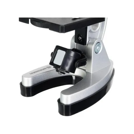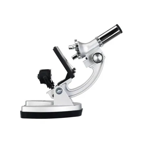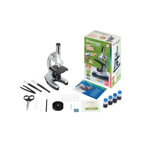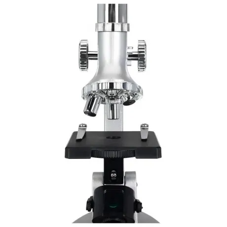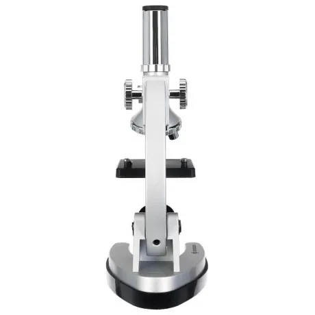 Bresser Junior Biotar 300–1200x – это монокулярная модель микроскопа с двумя типами подсветки: зеркалом и при помощи лампочки. Он подойдет юному любителю микробиологии в возрасте 8 лет и старше. Так как в комплект включены готовые микропрепараты, множество инструментов для исследований и принадлежности для выращивания артемии, микроскоп захватит внимание владельца с первых же секунд использования. Для исследований применяется метод светлого поля в проходящем свете. Оптическая система микроскопа включает окуляр и три объектива. Последние находятся в револьверном устройстве: вращая его, можно менять увеличение микроскопа. Микропрепараты необходимо располагать на предметном столике, для их фиксации используются два зажима. Блок подсветки расположен внизу – он сдвоенный: с одной стороны небольшое зеркало, которым внешний свет можно направлять на образец, с другой – лампочка, работающая от батарейки и обеспечивающая более мощное освещение. Под предметным столиком также находится диск с диафрагмами, позволяющий более точно корректировать интенсивность света. Микроскоп обладает довольно легкой конструкцией и не требует особых умений и знаний, поэтому станет идеальным вариантом первого в жизни микроскопа.