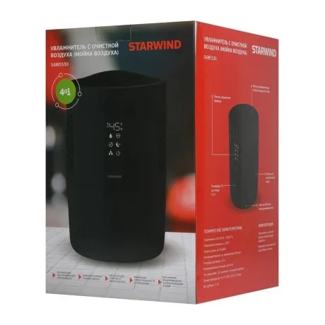 Мойка воздуха STARWIND SAW5530 объединяет в себе 4 функции: увлажнение, очищение, обеззараживание и ароматизацию воздуха. Этот климатический прибор обеспечивает оптимальный уровень влажности в помещении площадью до 40 кв. м в любое время года, а также делает очистку воздуха от крупных фрагментов пыли и шерсти. Мойка воздуха оснащена сенсорной панелью управления с цифровым дисплеем и сенсорными кнопками.