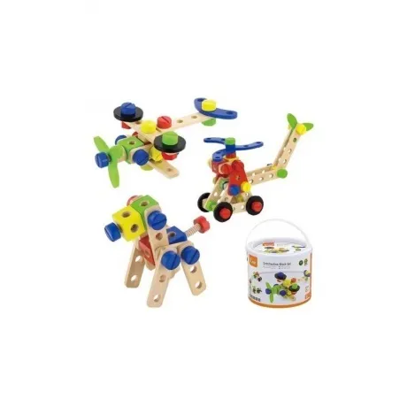 Деревянный конструктор VIGA в ведре идеально подойдет для малышей, кто любит строить и создавать что-то новое. В наборе 48 разных элементов: 4 колеса, отвертка, гаечный ключ, детали разных цветов и размеров, болтики и гаечки. С помощью этого конструктора малыш сможет не только собирать разнообразные конструкции, но и развить мелкую моторику рук, внимание, усидчивость, логику и воображение.