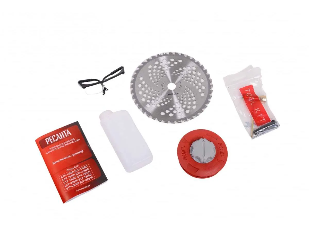 бензиновый триммер, защитный кожух, режущий диск, катушка с леской, рукоятки управления (левая и правая), ранцевый ремень, комплект ключей, паспорт продукции, защитные очки, коробка