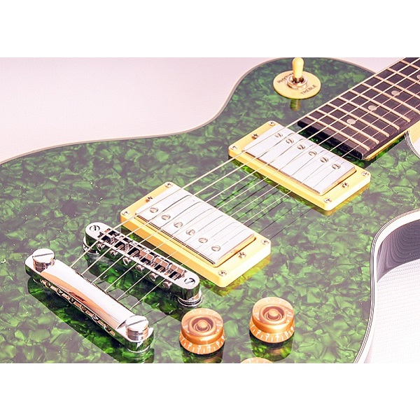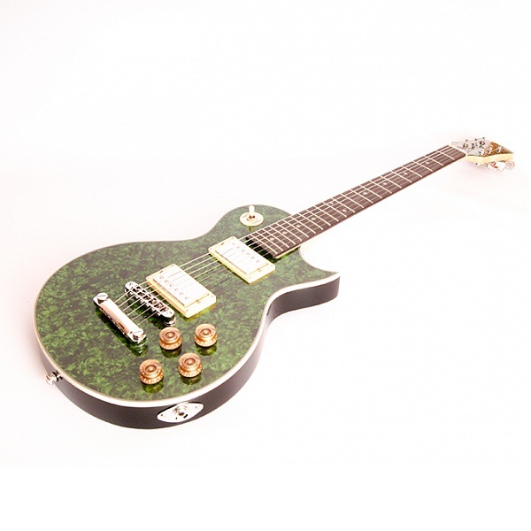Электрогитара Caraya E232FTGR Шестиструнная гитара с корпусом типа «Les Paul» из древесины твердых пород. Без защитной накладки. Гриф изготовлен из клена, накладка грифа из палисандра. Мензура - 648 мм, 22 лада из сплава меди и никеля. Цвет: зеленый. Позолоченная колковая механика. Колки расположены в два ряда. Гитара имеет четыре регулятора: два громкости, два тембра и трехпозиционный переключатель. Бридж - Tune-o-matic со стоп-баром. Два хамбакер звукоснимателя.