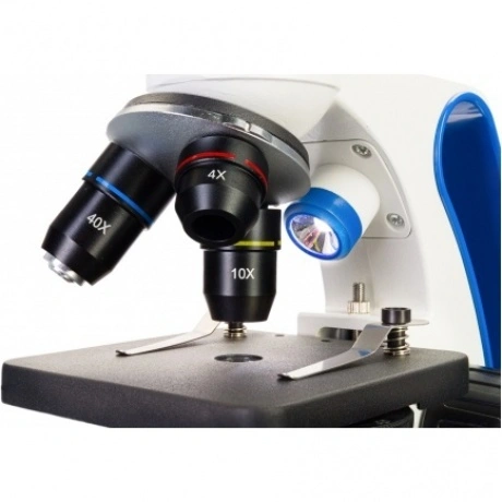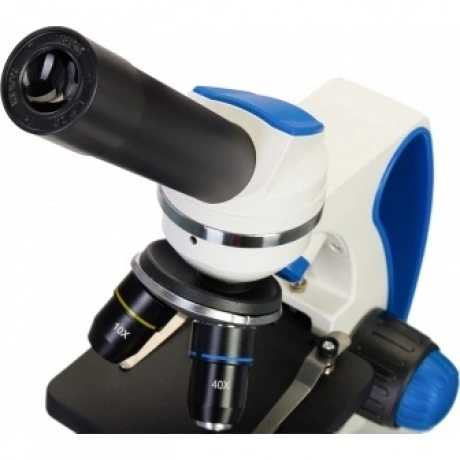 С монокулярным микроскопом Discovery Pico Gravity учеба в школе или колледже станет намного интереснее и результативнее. Он поможет погрузиться в увлекательный микромир и покажет простейших и структуру многих объектов окружающего мира. Также с помощью этого микроскопа можно проводить простые научные опыты и изучать жизнь в капле воды. В комплектацию включена познавательная книга о микромире, которая будет полезна начинающим биологам. Насадка микроскопа отклонена под небольшим углом в 30°, что повышает комфорт длительных наблюдений. Также насадку можно поворачивать вокруг оси на 360° – такая функция упрощает работу в группе, когда один и тот же образец должны посмотреть несколько человек. Все оптические элементы сделаны из стекла. Объективы 4х, 10х и 40х ахроматические, а окуляр 10х – широкопольный. Дополнительно объектив 40х имеет пружинящую оправу – защиту передней линзы от случайных повреждений. Общее увеличение микроскопа находится в диапазоне от 40 до 400 крат. Источник освещения – два светодиода, расположенные сверху и снизу от предметного столика. Благодаря этому наблюдения можно проводить как в проходящем, так и в отраженном свете. Яркость подсветки регулируется. Для работы подсветки требуются или подключение к сети переменного тока, или установленные батарейки. Сетевой адаптер включен в комплектацию. Еще одна особенность микроскопа – наличие точной фокусировки. Она позволяет быстрее и более плавно настраивать резкость картинки. Отметим наличие зажимов у предметного столика и диска с диафрагмами для регулировки светового потока от нижнего осветителя. Книга «Невидимый мир», включенная в комплектацию, упростит старт работы с прибором. Она рассказывает об устройстве микроскопа, о том, что можно наблюдать с его помощью, и о том, какие научные опыты можно провести прямо дома. Книга ярко иллюстрирована и написана «живым» языком без сложных для понимания терминов.