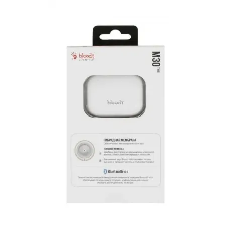 Наушники TWS A4Tech Bloody M30 – это стильное и функциональное решение для повседневного использования. Данная модель выполнена в лаконичном дизайне и относится к полностью беспроводным устройствам с конструкцией по типу вкладышей, благодаря чему может легко фиксироваться в ухе любой формы и отличается комфортом ношения даже в течение долгого времени. Другой особенностью устройства является высокое качество звука, что обусловлено использованием высококачественных компонентов с высокими рабочими показателями и поддержкой звуковой схемы формата 2.0. Благодаря этому данная модель позволит вам в полной мере наслаждаться качественным звучанием любимых композиций где бы вы не оказались. Кроме того, в конструкции предусмотрен микрофон, что позволит вам легко общаться по телефону. Управление громкостью и воспроизведением осуществляется при помощи сенсорных кнопок. Наушники TWS A4Tech Bloody M30 подключаются к устройствам при помощи Bluetooth 5.0, среди преимуществ которого можно отметить низкое потребление энергии, а также большой радиус действия – вплоть до 10 м. Питание модели осуществляется от встроенного аккумулятора, который способен обеспечить до 4 часов воспроизведения. Благодаря кейфу время работы может быть увеличено до 18 ч. Его зарядка осуществляется при помощи кабеля USB-C, который входит в комплект поставки.