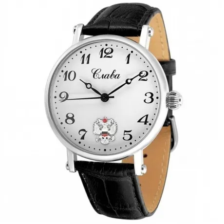 Мужские часы Слава 8091680/300-2409.В - корпус изготовлен из латуни, ремешок у модели из натуральной кожи, механизм часов балансовый, точность хода +40/ -20 сек. в сутки, у данной модели прочное минеральное стекло, поцарапать такое стекло довольно сложно (оно имеет показатель 7 по шкале минералогической твёрдости), вторым достоинством данного стекла является прочность, разбить такое стекло значительно сложнее чем сапфировое, именно поэтому данный вид стёкол наиболее распространён в часовой индустрии, модель обладает водонепроницаемостью 30 метров (или 3 атмосферы), поэтому они не испортятся от брызг воды, однако, для плавания не подходят.