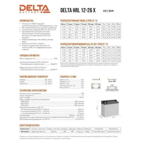 Delta HRL 12-26x– это обновленный в 2018 году выпускавшийся с 2003 года аккумулятор Delta HRL 12-26 из серии аккумуляторов Delta HRL (UPS Series). Аккумулятор сменил цвет с оранжевого на синий и в маркировке получил дополнительный индекс «X». Герметизированный VRLA cвинцово-кислотный аккумулятор Delta HRL 12-26xнапряжением 12В и емкостью 28Ач изготовлен по технологии AGM (с микропористым заполнителем, пропитанным электролитом). Корпус изготовлен из негорючего ABS пластика. Срок службы аккумулятора достигает 12 лет. Аккумулятор относится к линейке DELTA UPS series и предназначен для работы в системах бесперебойного питания (ИБП), системах связи, ЦОД. Обладает низким внутренним сопротивлением и высокой плотностью энергии.