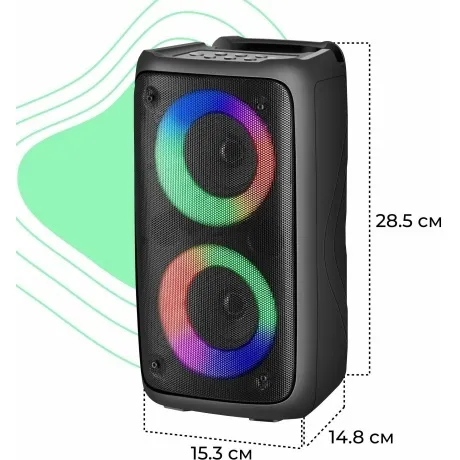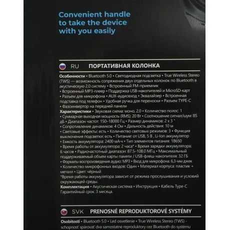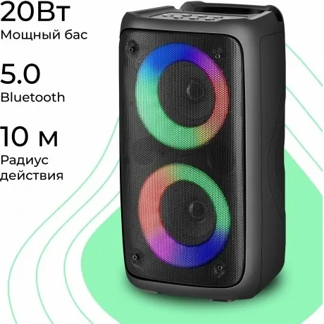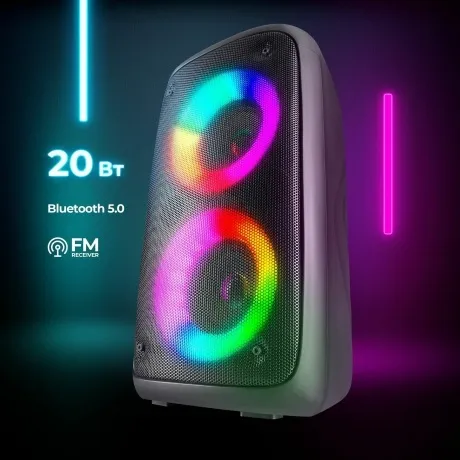 Мощная портативная акустическая Bluetooth система с LED подсветкой, встроенным MP3-плеером и FM-тюнером. Поддержка флеш накопителей и карт памяти microSD. Bluetooth 5.0