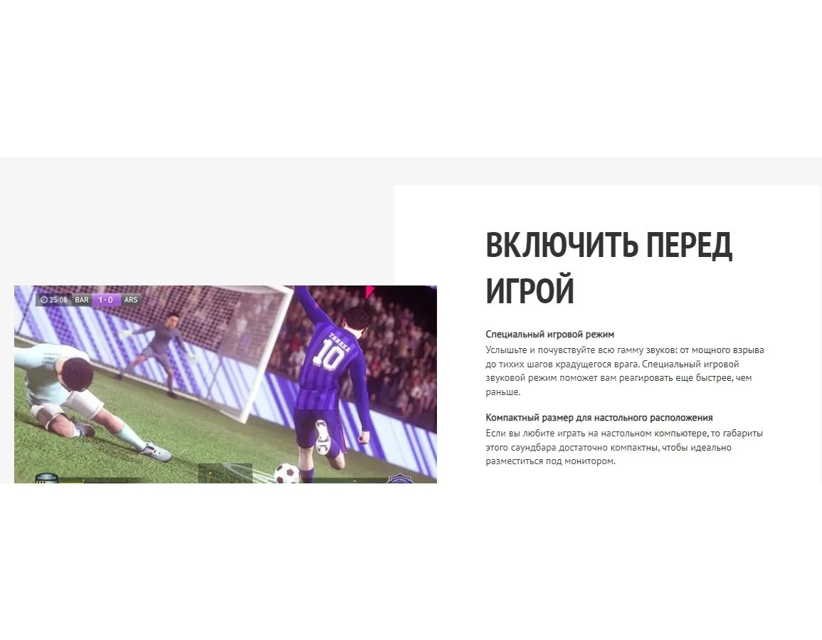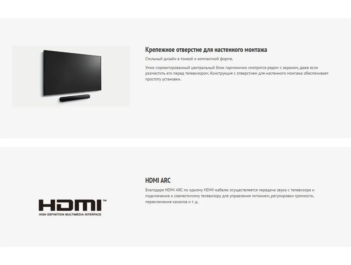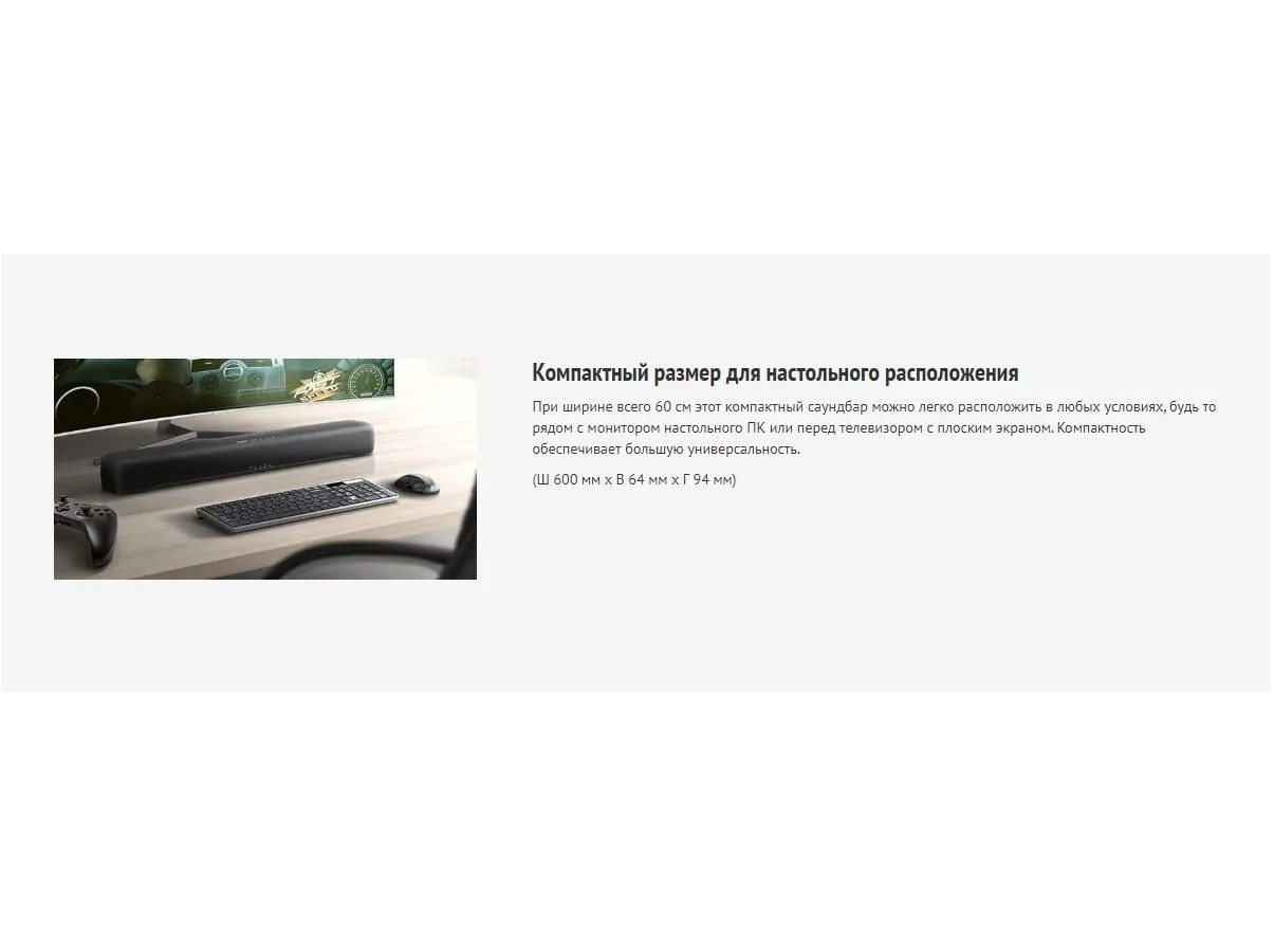 Саундбар Yamaha SR-C20A черного цвета представляет собой компактное, но невероятно мощное и функциональное устройство для воспроизведения чистого звука. Он выполнен в виде звуковой панели мощностью 100 Вт со встроенным сабвуфером. Наличие в конструкции саундбара декодеров Dolby Digital, Dolby Pro Logic II обеспечивает создание объемного звучания и эффекта полного погружения. Для этого саундбар можно разместить под телевизором или закрепить на стене. А его настройка и управление осуществляются при помощи специального приложения на смартфоне или с пульта ДУ. Для подключения саундбара Yamaha SR-C20A предусмотрены на его корпусе разъемы AUX, S/PDIF (оптический) и HDMI. Также имеется встроенный интерфейс Bluetooth. Особенностью саундбара является наличие игрового звукового режима, при котором воспроизводится каждый звук из игры: от тихого шепота до мощного взрыва. А поддерживаемая технология ClearVoice повышает четкость диалогов при просмотре фильмов или передач. Компактные размеры саундбара делают его удобным для размещения практически в любом месте комнаты.