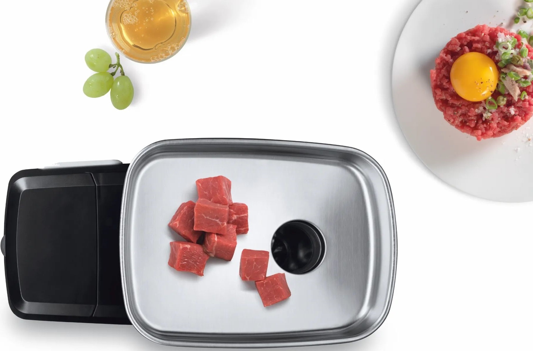 мощность 800 Вт, сделана из пластика и металла, насадка-терка, насадка для шинковки, для приготовления колбас, для кеббе, шнековая соковыжималка, отсек для хранения насадок