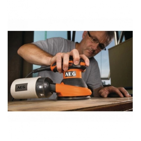 Эксцентриковая шлифмашина AEG EХ 125 ES имеет подошву с диаметром 125 мм. Машина справится со всем спектром задач, кроме вращения совершаются еще и колебательные движения с амплитудой 2.4 мм. Машина достаточно легкая, ее вес составляет 1.7 кг. Этот параметр станет преимуществом при работе с оснащением и его транспортировке. В AEG EХ 125 ES создана система для быстрого отвода пыли. Она позволяет комфортно работать и удалять мусор из зоны обработки. Вместе с машиной поставляется пылесборник. Чтобы непрерывно работать с оборудованием, Вы можете воспользоваться специальным фиксатором. Система плавного пуска обеспечивает безопасность при эксплуатации и постепенный разгон. Корпус изготовлен с применением пластика, который не повреждается и переносит все возможные нагрузки. Резиновые вставки исключают скольжение инструмента, что станет дополнительным преимуществом. Замена шлифовальных полотен происходит при помощи липучки, эта процедура занимает минимальное количество времени и не вызывает затруднений. Скорость при работе может составлять от 7000 до 12000 оборотов за минуту.