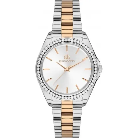 Стильные женские часы Bigotti на стальном браслете. Корпус украшен кристаллами Swarovski. Точность хода обеспечивает японский кварцевый механизм Miyota. Браслет с раскладывающейся застежкой.