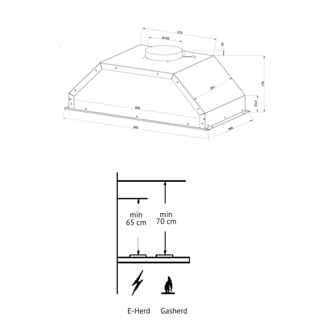 Полностью встраиваемая вытяжка Kuppersberg Intouch 60 W оптимальна для установки в помещениях площадью до 23 м? при высоте потолков 2,6 м. Прибор монтируется над газовой плитой на уровне не ниже 70 см, над электрической — от 65 см. Устройство с диаметром штуцера 120 мм питается от стандартной электросети.
