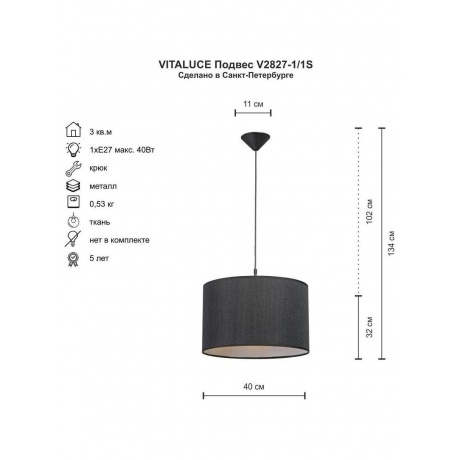 подвесная люстра vitaluce v2827-1/1s с одним светильником, максимальная мощность лампы 40 вт, цоколь e27, черный матовый цвет, степень защиты ip20, напряжение питания 220-230 в.