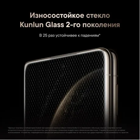Погрузитесь с головой в любимые приложения, фильмы и игры и наслаждайтесь высоким качеством экрана HUAWEI X-True с технологией HDR Vivid и адаптивной частотой обновления 1–120 Гц, благодаря которой каждое проведение по экрану, прокрутка и смена изображения выполняются невероятно плавно, вызывая восхищение. Суперпрочное стекло Kunlun Glass 2-го поколения в 25 раз более ударопрочное и способно выдержать испытания как в повседневной жизни, так и в неожиданных экстремальных ситуациях. Внутренний экран смартфона из углеродного волокна на 65% прочнее и обладает уровнем сопротивления экструзии 380 ГПа, благодаря чему способен выдержать всевозможное давление. Рамка из алюминиевого сплава 550 Мпа устойчива к падениям и другим воздействиям. Изготовленный из высокопрочной стали 1900 Мпа механизм обеспечивает компактность и плавное сгибание, что подтверждается испытанием временем. Водонепроницаемость класса IPX8 при погружении на 2 метра защищает ваш смартфон от случайных брызг или неожиданно разлившейся воды. Распределенная инновационная система охлаждения обеспечивает эффективный отвод тепла и быстро охлаждает смартфон даже при интенсивной нагрузке благодаря размещению основных источников генерирования тепла в разных секторах смартфона, графеновому материалу с высокой теплопроводностью 2000 Вт/(м·K) и 3D-механизму жидкостного охлаждения с испарительной камерой.