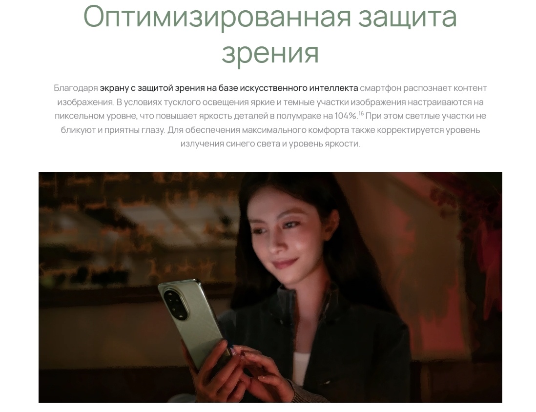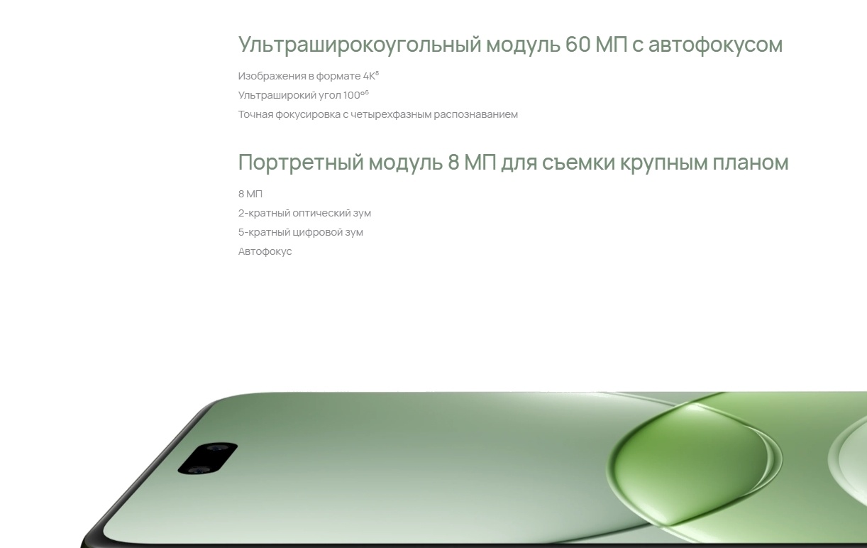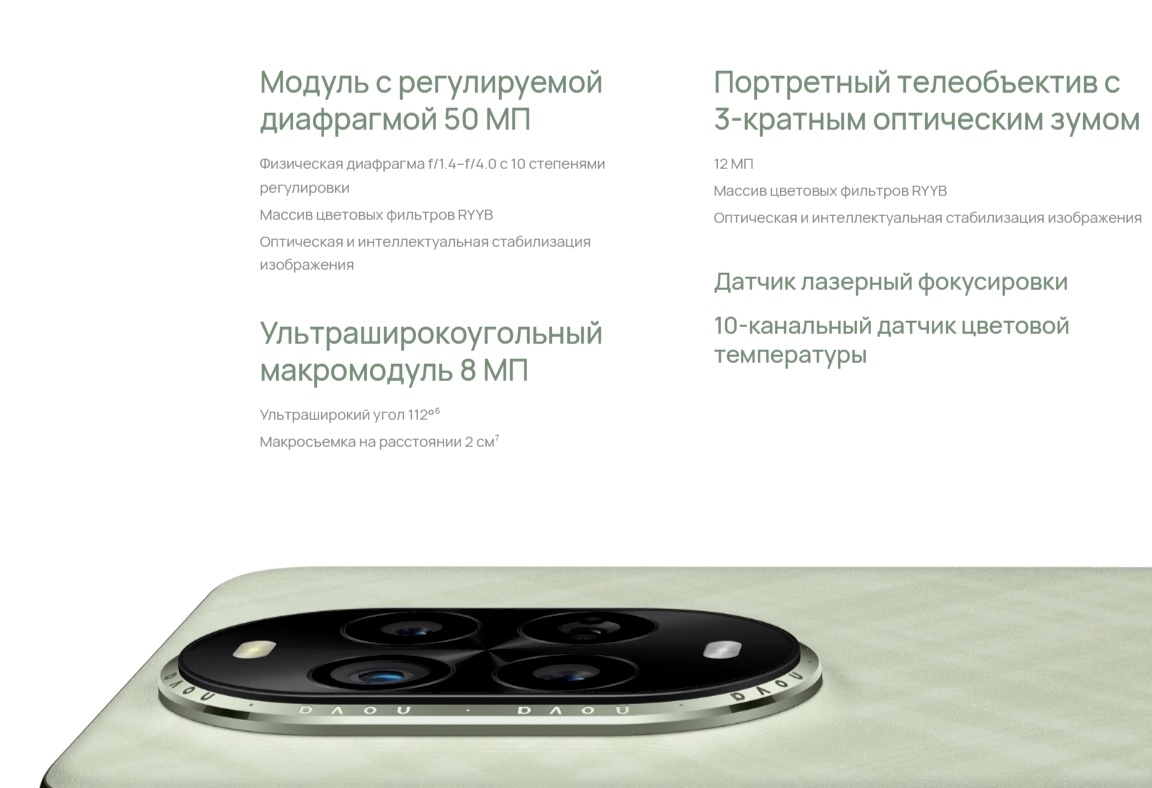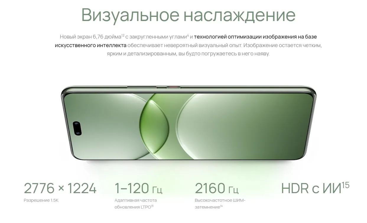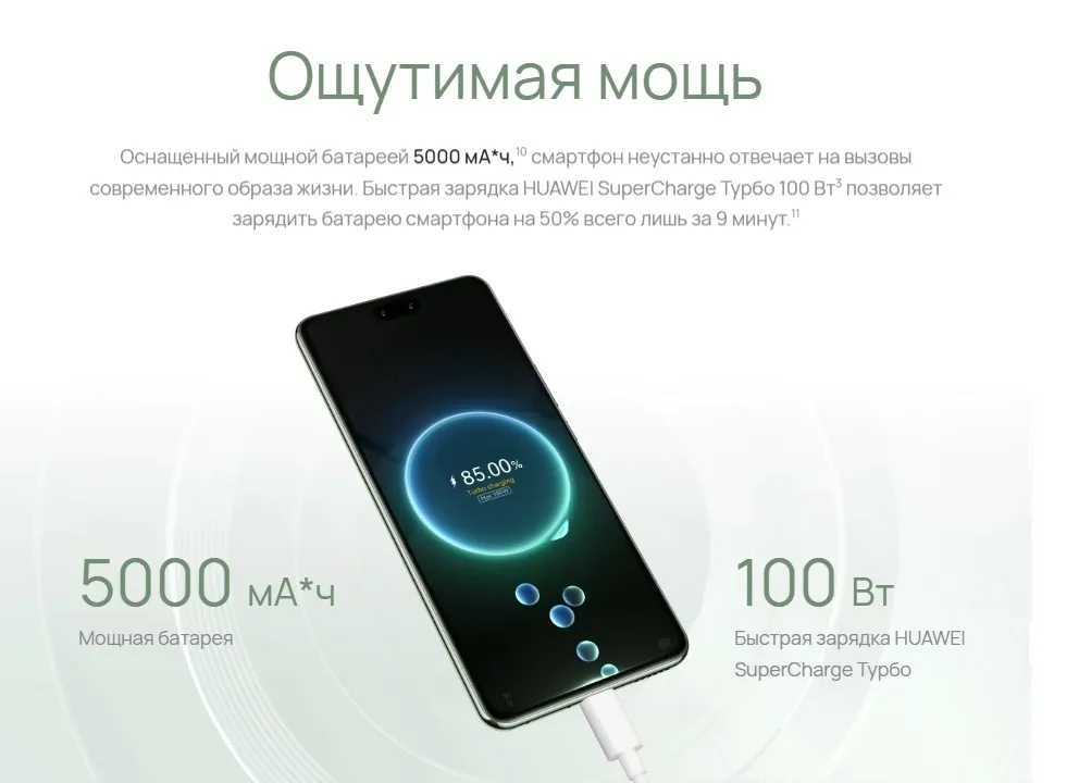 Откройте для себя мир портретной съемки, его безграничные возможности, красоту и стиль. Уникальная технология оптимизации параметров и повышения качества изображения позволяет сгладить контур лица и текстуру кожи, выровнять тон кожи, обеспечить гармоничный баланс света и тени. Фронтальный 0.7–5-кратный зум предоставляет широчайшие возможности съемки фото. Технология зума с разным фокусным расстоянием позволяет переключаться между панорамным видом и режимом макросъемки для достижения невероятных результатов. Физическая регулируемая диафрагма интеллектуально адаптируется под сценарий съемки, позволяя запечатлеть как невероятные пейзажи, так и сфокусироваться на чем-то конкретном. Запечатлевайте лучшие моменты вашей жизни, отдавайтесь фотосъемке со всей страстью, пусть ваши кадры станут настоящими фотошедеврами. Оснащенный мощной батареей 5000 мАч, смартфон неустанно отвечает на вызовы вашего образа жизни. Быстрая зарядка HUAWEI SuperCharge 100 Вт позволяет зарядить батарею смартфона на 50% всего лишь за 9 минут. Точность контроля температуры зарядки оптимизирована до 0.1 °C, при этом ток не колеблется. Это способствует более эффективной зарядке устройства и предотвращает его перегрев. Система устройства поддерживает многоканальную защиту, включая защиту адаптеров и кабелей, а также защиту при зарядке в ночное время и защиту от перегрузки, что продлевает срок службы батареи в целом.