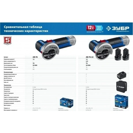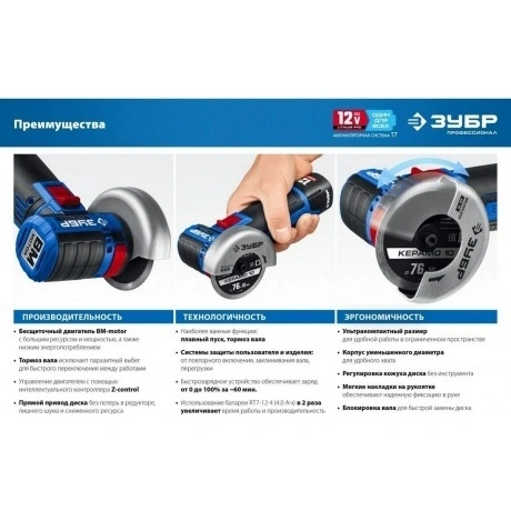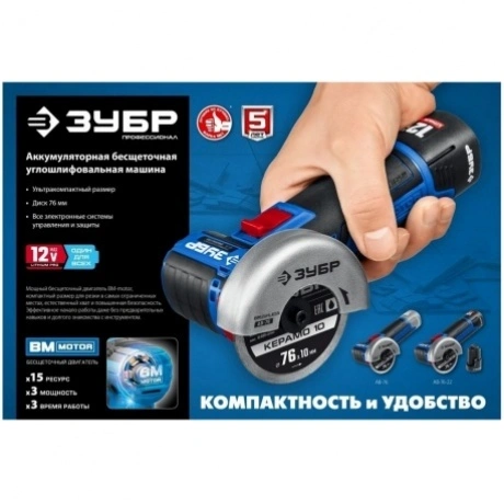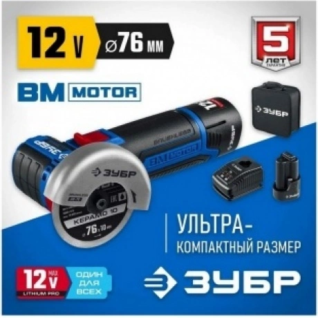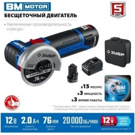 Отзывы о товаре Угловая шлифовальная машина бесщеточная ЗУБР 12 В, d76 мм, 2 АКБ тип Т7 (2 А·ч), сумка, Профессионал (AB-76-22)