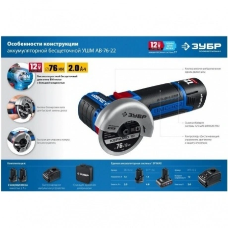 Бесщеточная угловая шлифмашина ЗУБР Профессионал 12 В, 2 АКБ, в сумке AB-76-22 предназначена для зачистки, шлифовки и резки металлов, обработки бетона и камня при установке соответствующих шлифовальных, отрезных, алмазных кругов. Комплектуется двумя аккумуляторами.