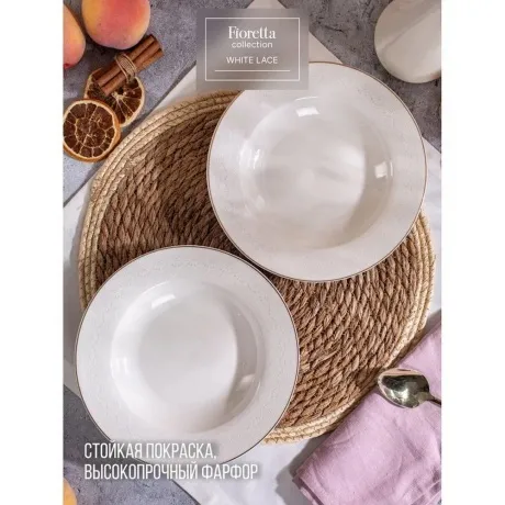 Суповая тарелка FIORETTA WHITE LACE диаметром 23 см представляет собой элегантное решение для сервировки обеденного стола. Изготовленная из качественной керамики, она обладает прочностью и долговечностью. Белый однотонный дизайн тарелки позволяет ей гармонично вписаться в любой интерьер, добавляя изысканности и стиля. Благодаря возможности использования в микроволновой печи, тарелка удобна для быстрого разогрева супов и других блюд. Легкость ухода обеспечивается возможностью мытья в посудомоечной машине, что экономит ваше время. Несмотря на отсутствие бортиков, тарелка сохраняет практичность и удобство в использовании. Суповая тарелка FIORETTA WHITE LACE станет незаменимым элементом вашей посуды, сочетая в себе функциональность и эстетическую привлекательность.