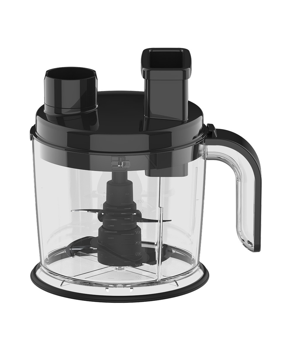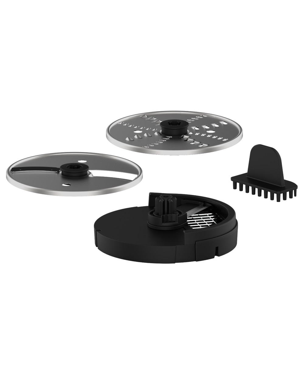 Моторный блок, Большая чаша измельчителя с крышкой, Малая чаша измельчителя с крышкой, Стакан для смешивания, Насадка-блендер, Насадка-венчик, Насадки для миксера 2 шт, Переходник для насадки-венчика, Переходник для насадок миксера, Съёмная втулка, Насадка-диск для нарезки кубиками, Насадка-диск для шинковки, Насадка-диск для тёрки, Насадка для приготовления пюре, S-образный нож 3 шт, Толкатель