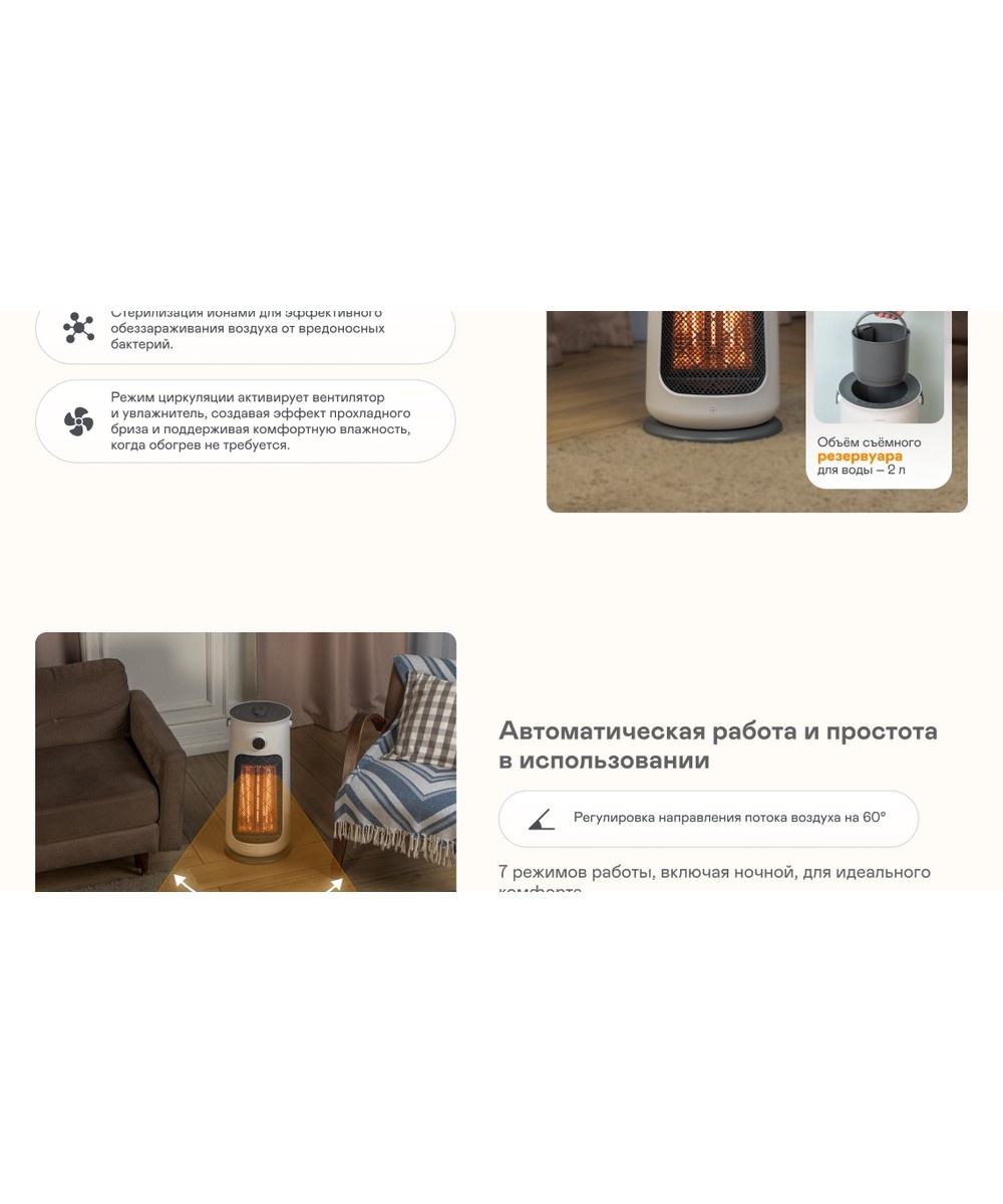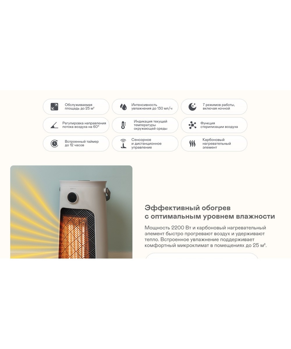 Согревайте свой дом, заботьтесь о коже и дыхании вместе с обогревателем, который сочетает эффективный обогрев и бережное увлажнение воздуха – для максимального комфорта и уюта.