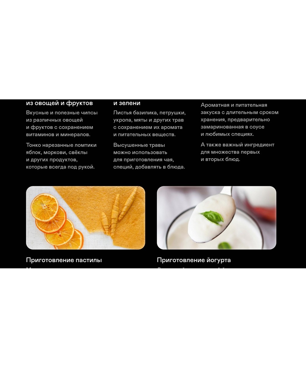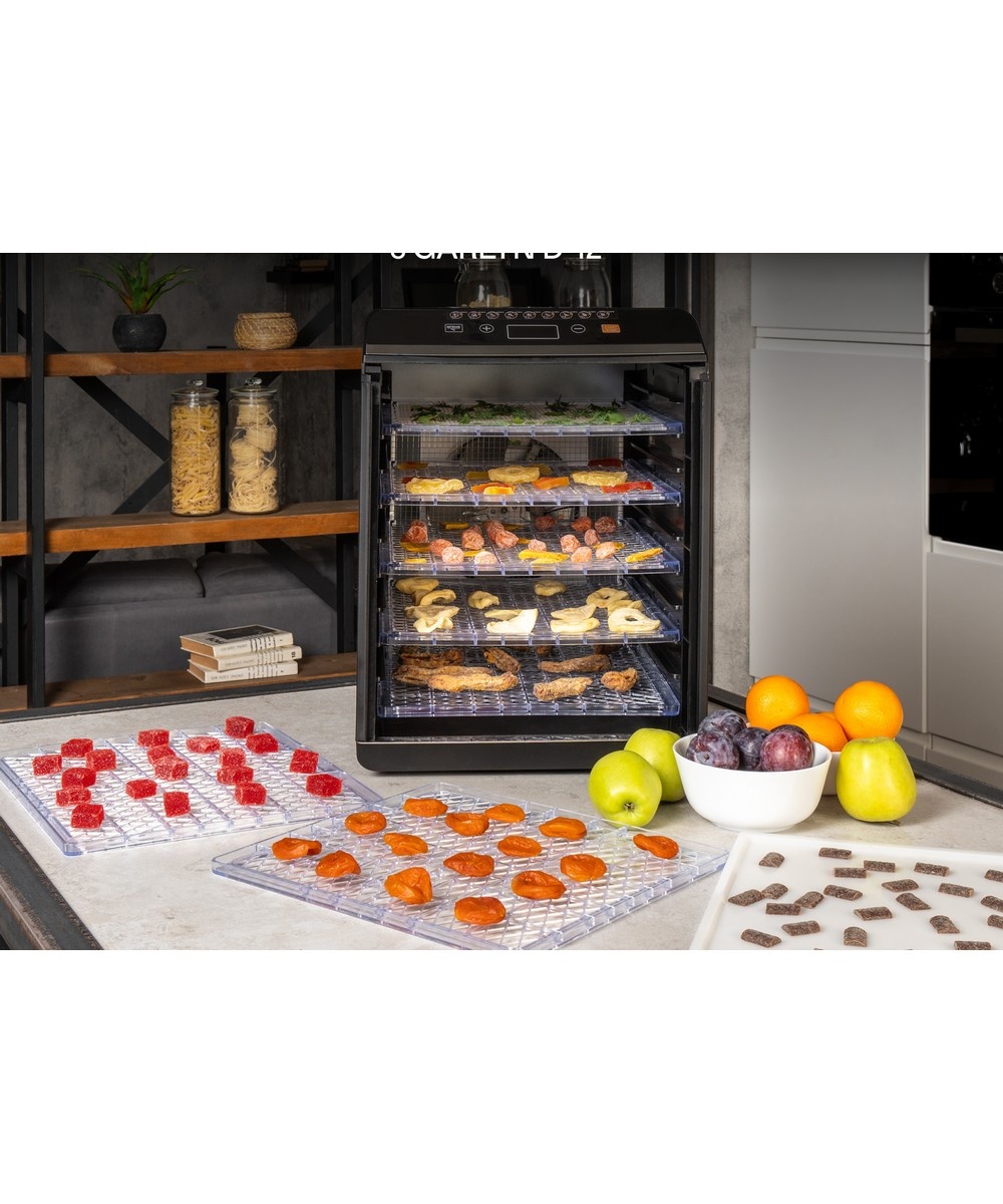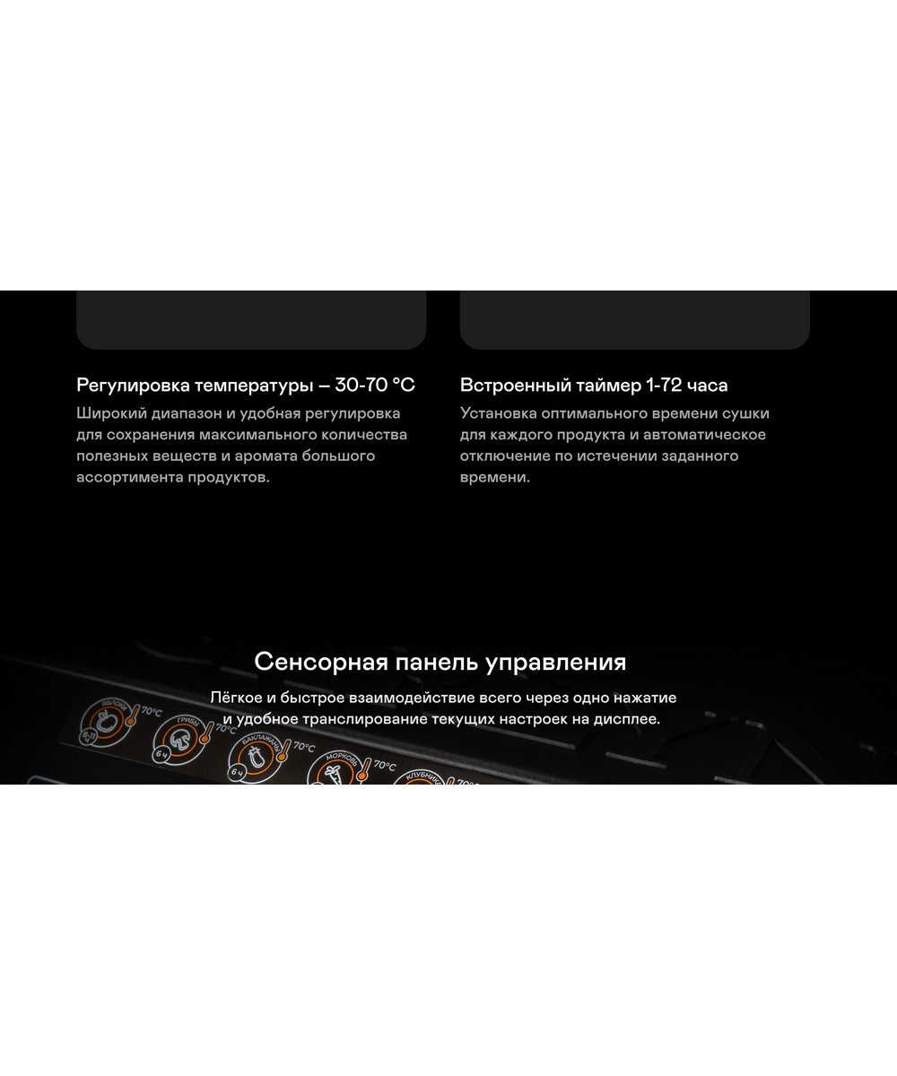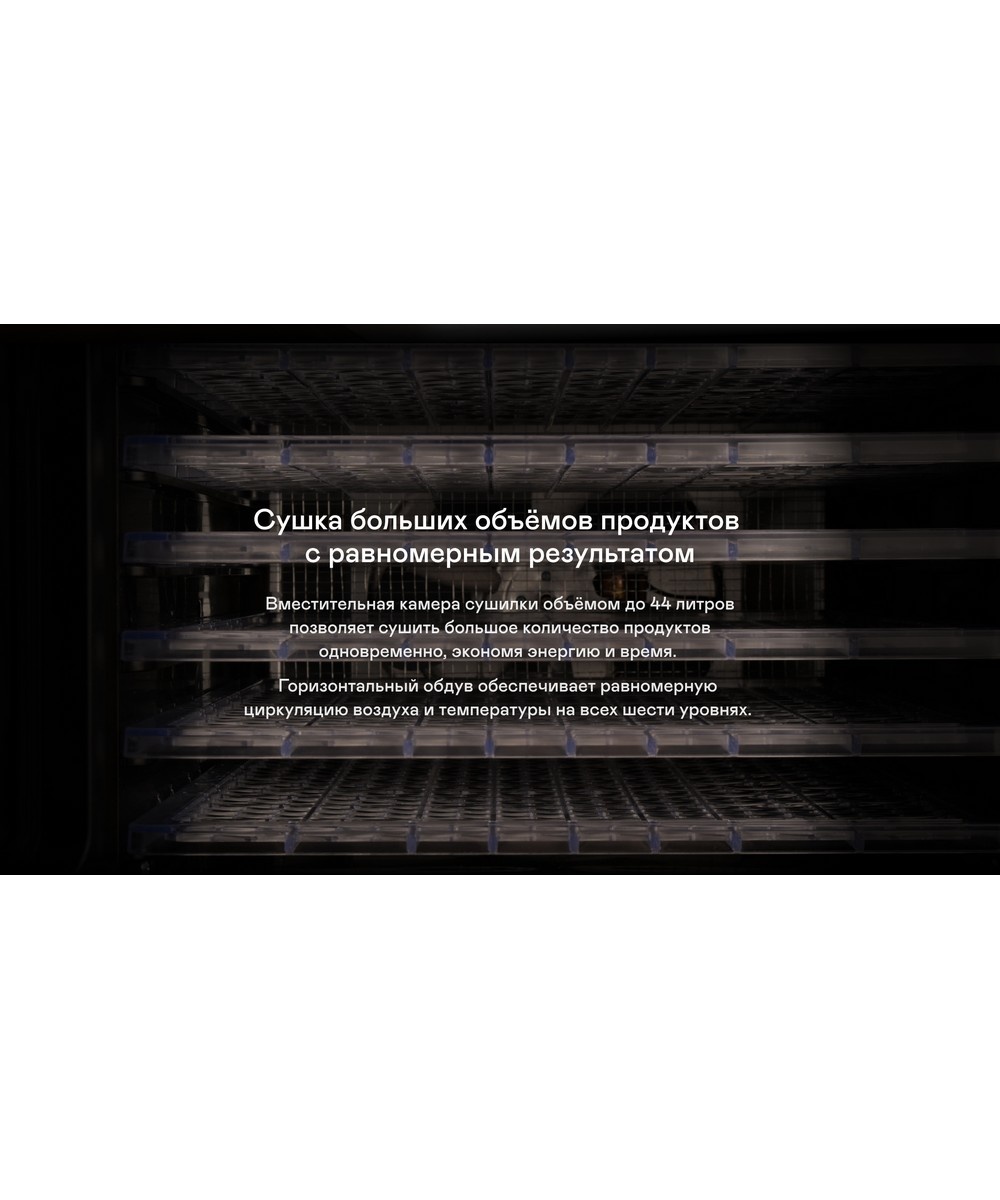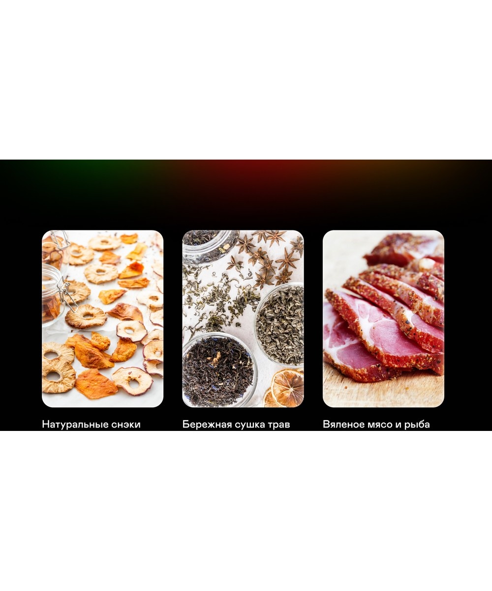 Идеальный помощник для сушки овощей, фруктов и ягод в больших объёмах. Точная регулировка температуры для идеального результата с любыми продуктами и горизонтальный обдув для равномерной сушки.