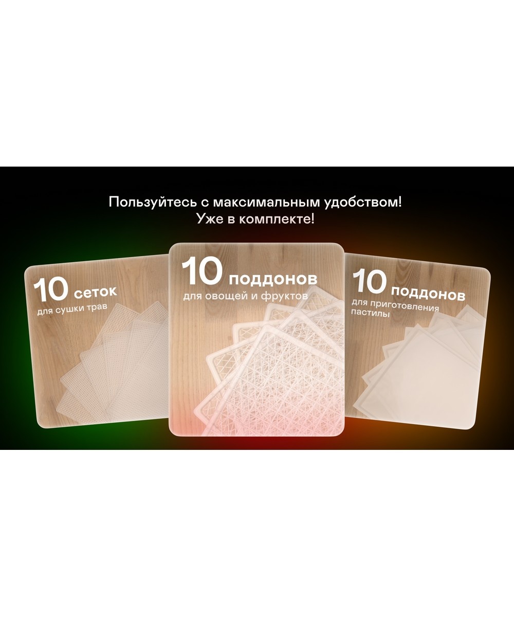 Сушилка электрическая для овощей и фруктов, Уровень для овощей и фруктов 10 шт, Поддон для приготовления пастилы 10 шт, Сетка для сушки трав 10 шт, Руководство пользователя, Краткая инструкция пользователя
