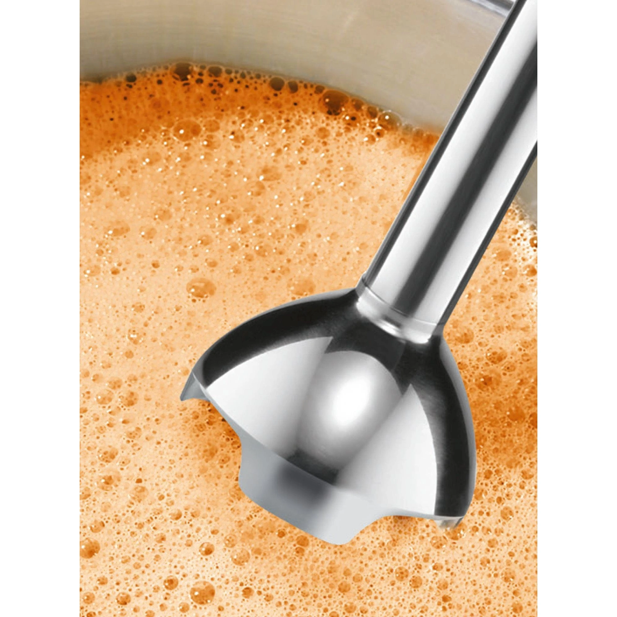 Специальная конструкция погружной насадки предотвращает разбрызгивание во время смешивания. Эргономичная ручка блендера с удобным управлением гарантирует максимальный комфорт в использовании. Наличие дополнительных насадок делает прибор универсальным помощником на кухне.