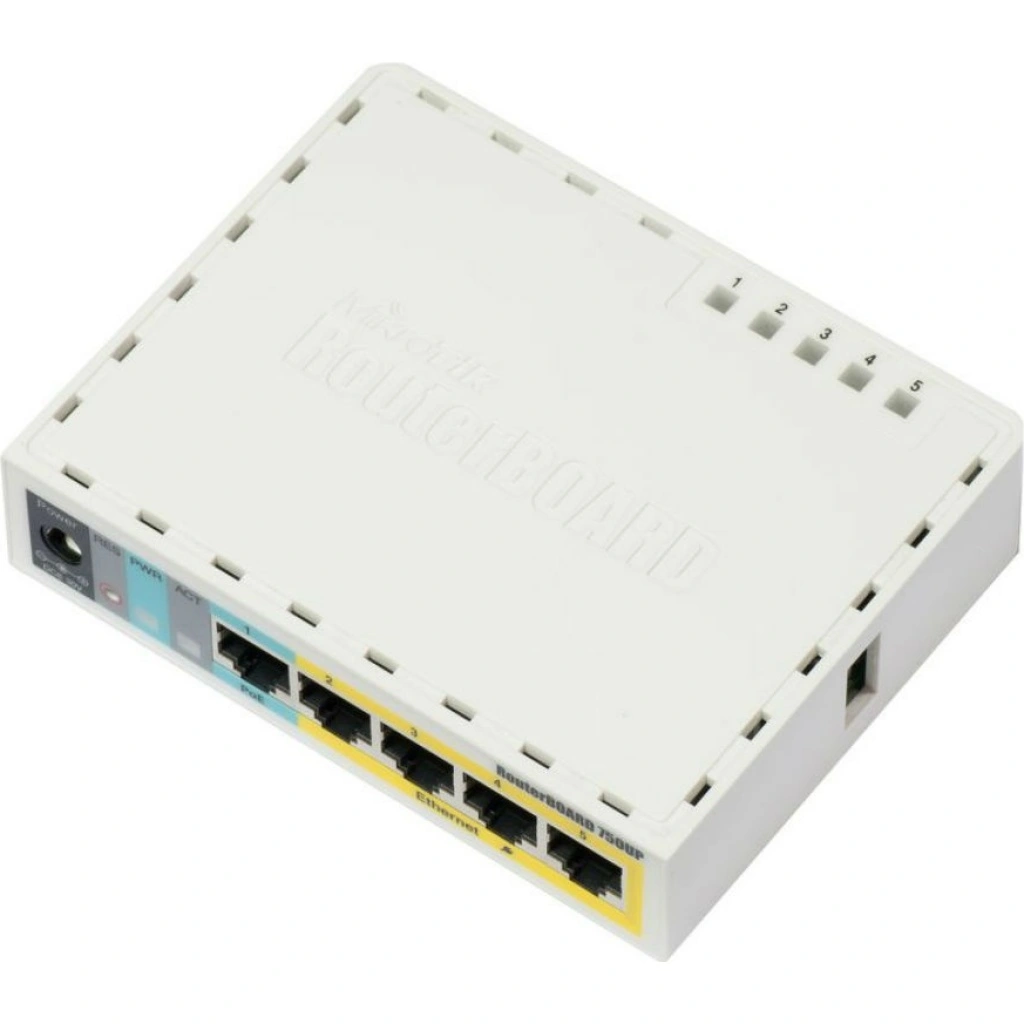 Новый небольшой пятипортовый Ethernet-роутер c USB-портом и выходом PoE, вышел на замену модели Mikrotik RB750Up. Порты 2-5 могут питать другие PoE-совместимые устройства с таким же вольтажем, что и на этом роутере. Максимальная мощность тока - 1 А на порт или 2 А на все порты, все Ethernet порты экранированы.