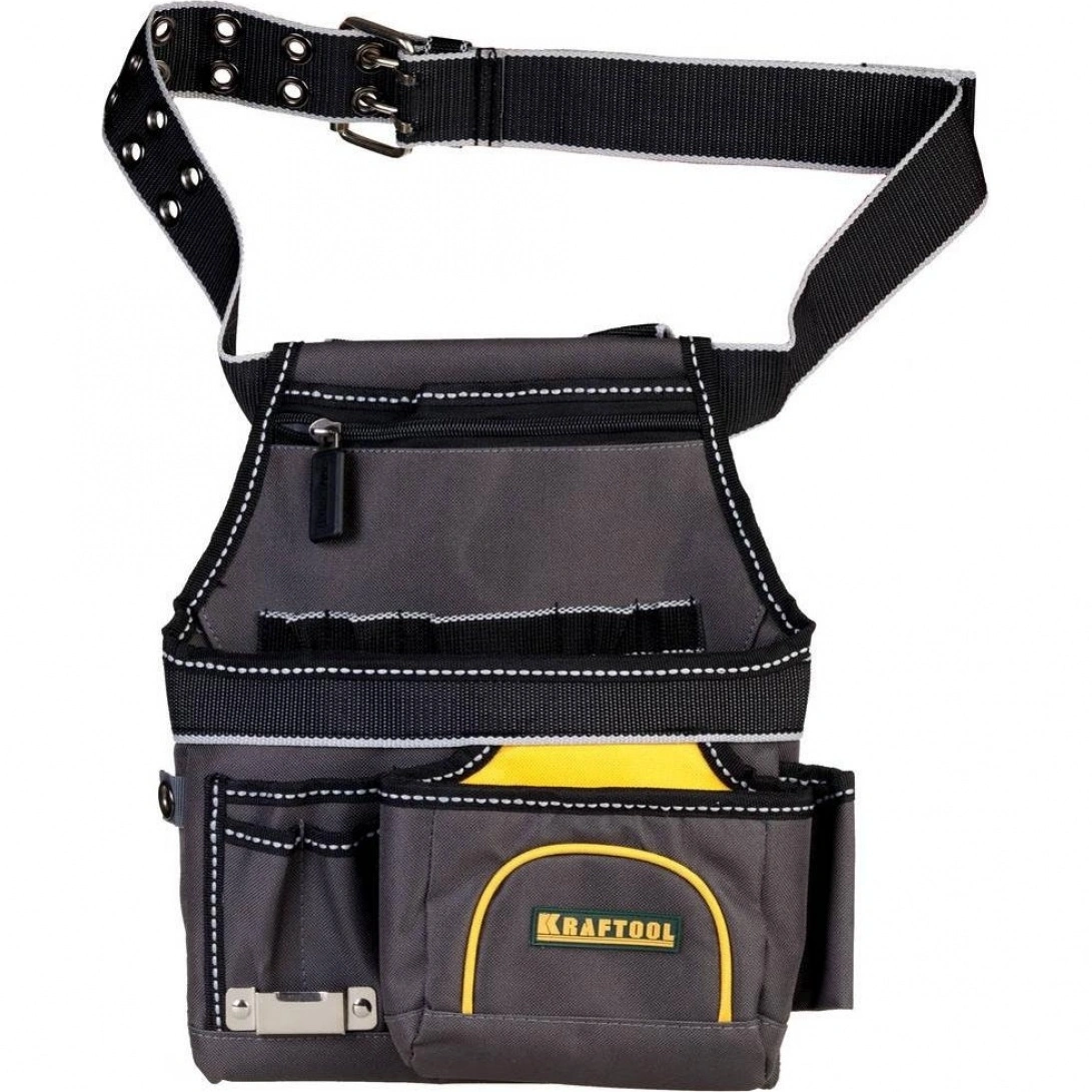 Сумка для инструментов Kraftool отличается продуманным дизайном, включающим 9 отделений, которые позволяют максимально эффективно организовать хранение различных инструментов и аксессуаров. Компактный и легкий вес в 0,63 кг делает её удобной для переноски, снижая нагрузку при транспортировке инструментов.