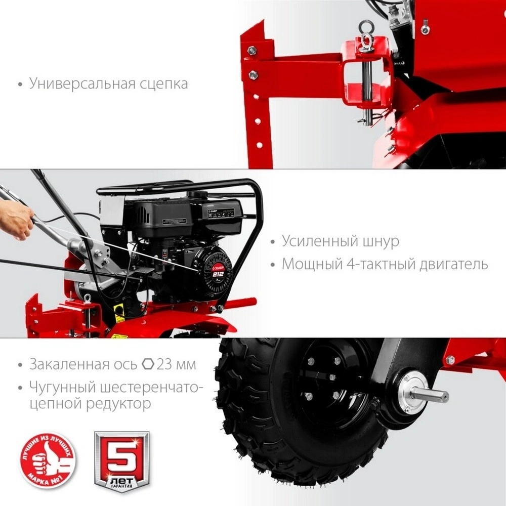 Мотоблоки ЗУБР – это надежные и мощные устройства, созданные для эффективной обработки почвы и выполнения различных сельскохозяйственных работ. Этот мотоблок оснащен бензиновым 4-х тактным двигателем мощностью 7 лошадиных сил, что обеспечивает высокую производительность и долговечность в эксплуатации. Мотоблоки ЗУБР имеют вес в 93 кг, что придаёт устойчивость и снижает вибрацию при работе.